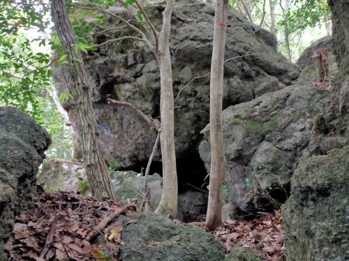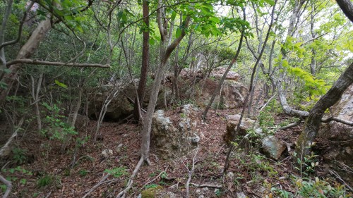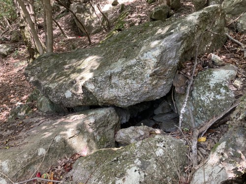 ・2つの巨岩があり、その前方が窪地になっており、それぞれの岩の下側に岩穴がある。