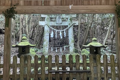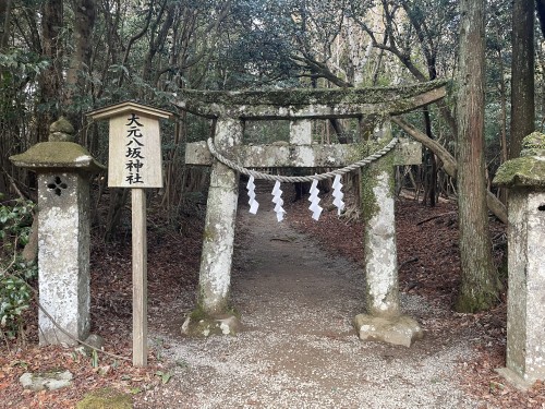 北側には比売大神の父とされる須佐能袁命を祭る「大元八坂神社」がある。「大元八坂神社」の背後にも磐座がある。